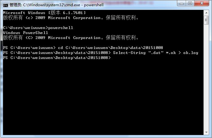接下来就是问题的关键了,我们知道Linux下有个grep命令,然而PowerShell下也有个类似的命令Select-String,最简单的用法是Select-String "匹配的内容" *.文件后缀 > 自定义文件名.自定义文件后缀,如我们需要提取每个ok文件内容中的记录数这一行(当然,这里只有一行,然后很多场景下内容不只一行),可以使用:Select-String ".dat" *.ok > ok.log,“>”和Linux系统中一样,表示重定向,这里是把提取的内容全部输出到一个ok.log文件当中,这里会自己帮我们创建该文件。