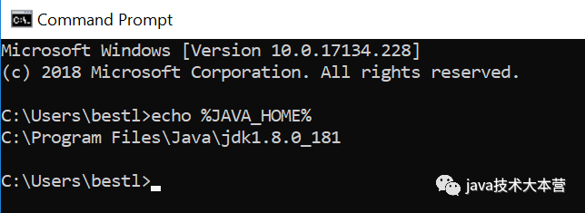 再打开cmd , 输入 echo %JAVA_HOME%就可以看到我们刚才设置的变量了: