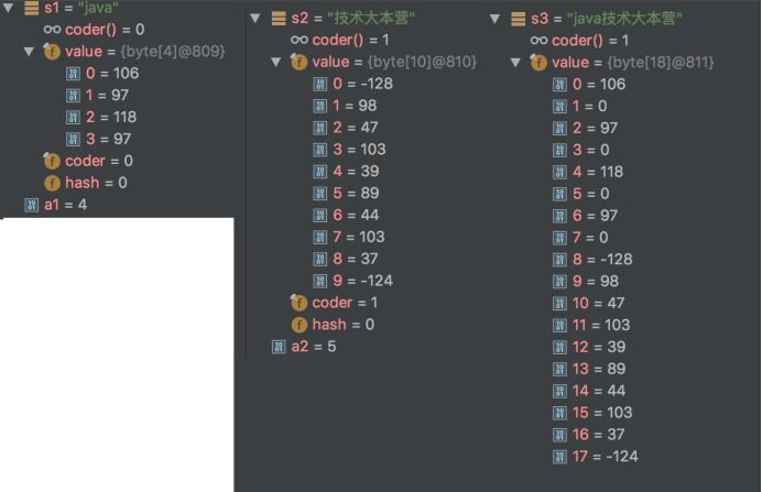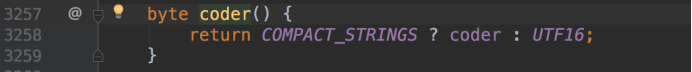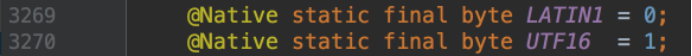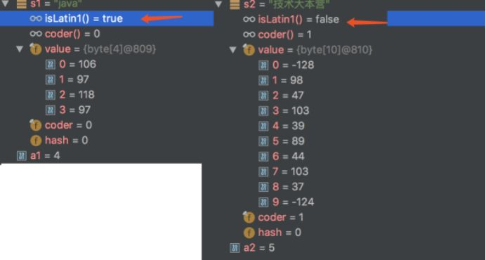 在源码中,我们可以看到关于0和1的定义:0是LATIN1方式编码。1是UTF16的方式编码。如下图所示:我们通过class level watch 调用isLatin1()方法,可以看到 s1是通过latin1编码。s2和s3是通过UTF16编码。