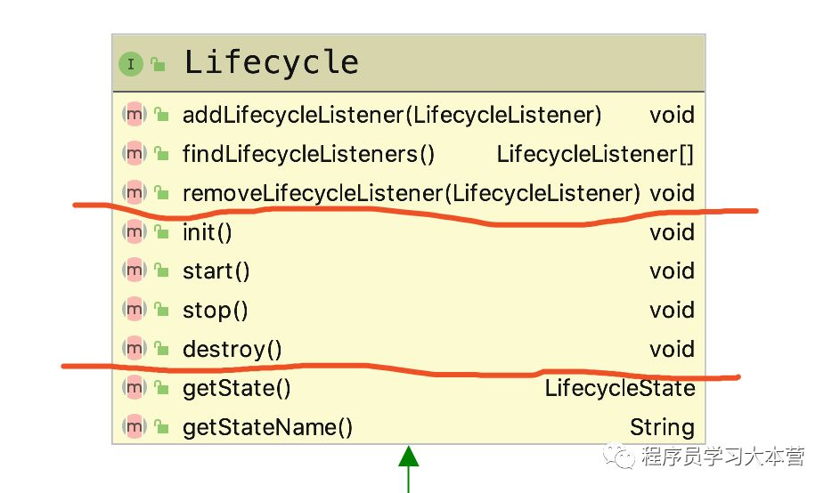 中间四个方法,代表着组件的四种状态:init(),初始化, start() 启动,stop()停止,destory(销毁),这些通过字面意思就能猜出来.tomcat官方给了一张生命周期和状态对应的流程图: