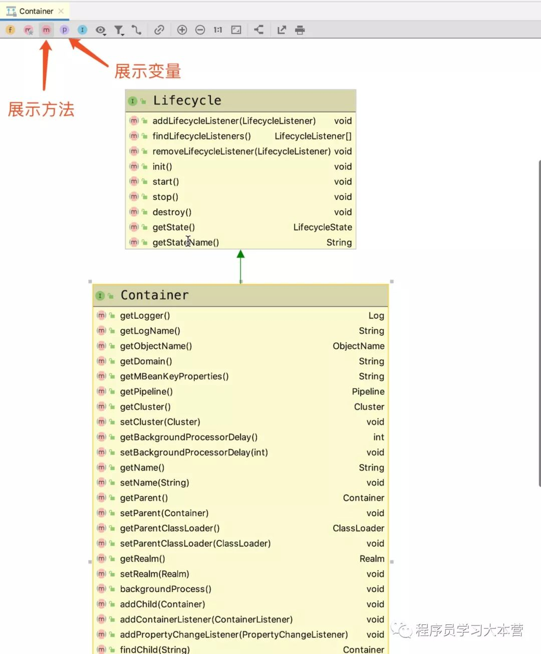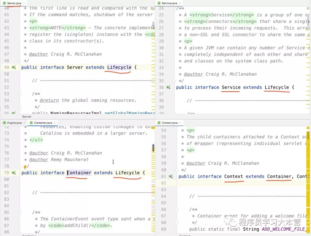 通过下图我们可以看到,在我们直接使用的Context,Service,Server上面还有一层接口: Container 和 Lifecycle
