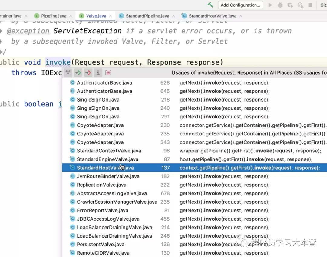 我们以StandardEngineValve为例,可以看到,对于同一个request和response,他在Invoke方法中,又调用了host的valve的inove