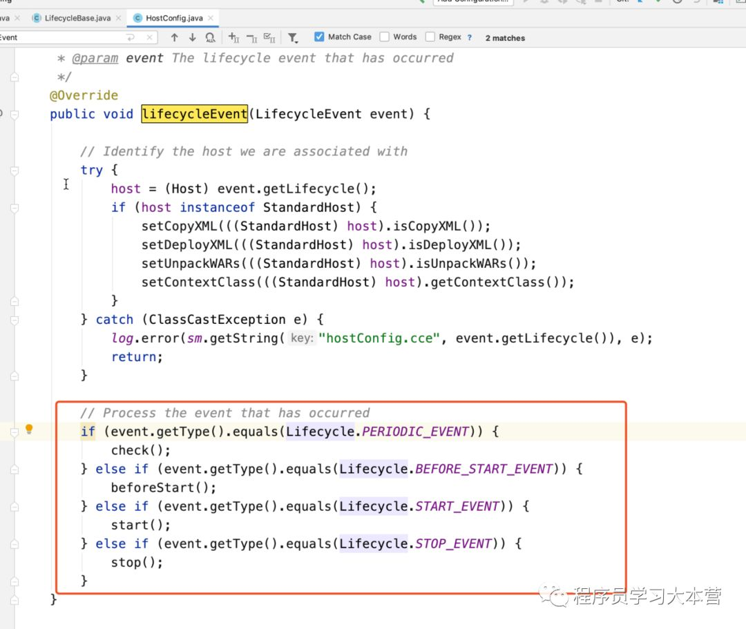 当执行server的start时,就会去向所有的监听器传播 CONFIGURE_START_EVENT这个事件.但是监听器对这个事件做不做响应,就是对应的实际监听器所做的决定,如下图所示,HostConfig ,在接收到事件时,要判断类型,对不同类型的事件,做不同的处理. 基本上Config都继承了 LifecycleListener 这个接