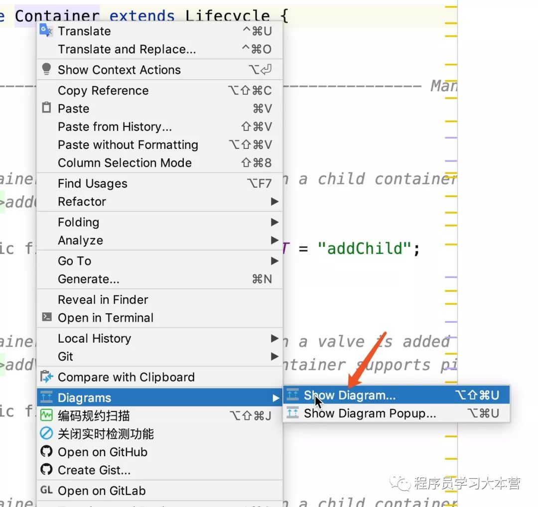 我们可以通过idea的类图工具,查看类的继承以集接口相关的方法,对着类名点右键,然后可以看到相关的图