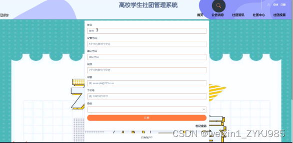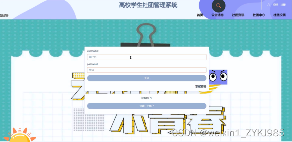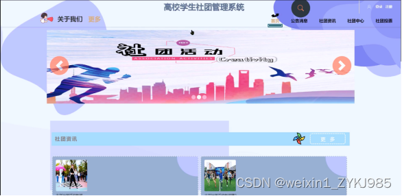 (1)首页信息:当用户进入本高校学生社团管理系统的前台的时候,首先展示在眼前的是导航栏、公告消息、社团资讯、社团中心、社团投票等信息,用户可以根据自己个人的需求进行查看;