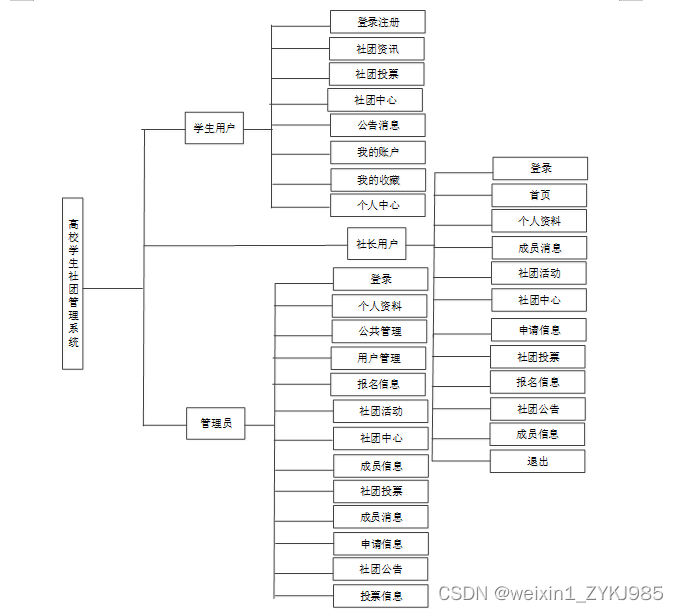 高校学生社团管理系统整体的功能模块包括管理员+学生用户+社长用户三个模块,实现了对学生社团相关信息的查询管理,系统功能模块如图所示。