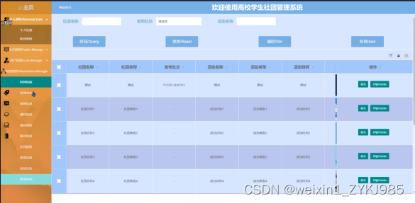 (5)社团活动:管理员点击“社团活动”会显示出所有的社团信息,支持输入社团名称对社团活动信息进行查询,如果想要添加新的社团活动信息,点击“新增”按钮,输入社团名称、社团类型、发布社长、活动名称、活动类型等信息,点击“提交”按钮就可以添加了,同时可以选择某一条社团活动信息,点击“删除”进行删除,也可以对用户提交的社团活动报名的信息进行管控,也可以点击后面的“报名”按钮对社团活动的报名信息进行更新维护;
