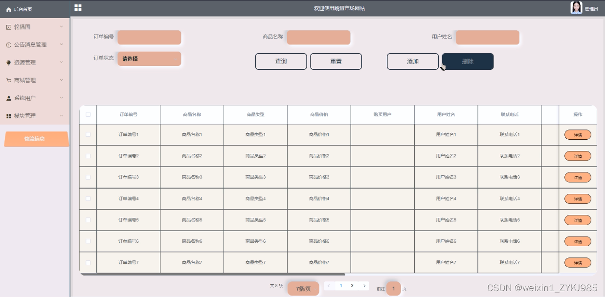 (7)商城管理:管理员对用户提交的商品订单进行管控。