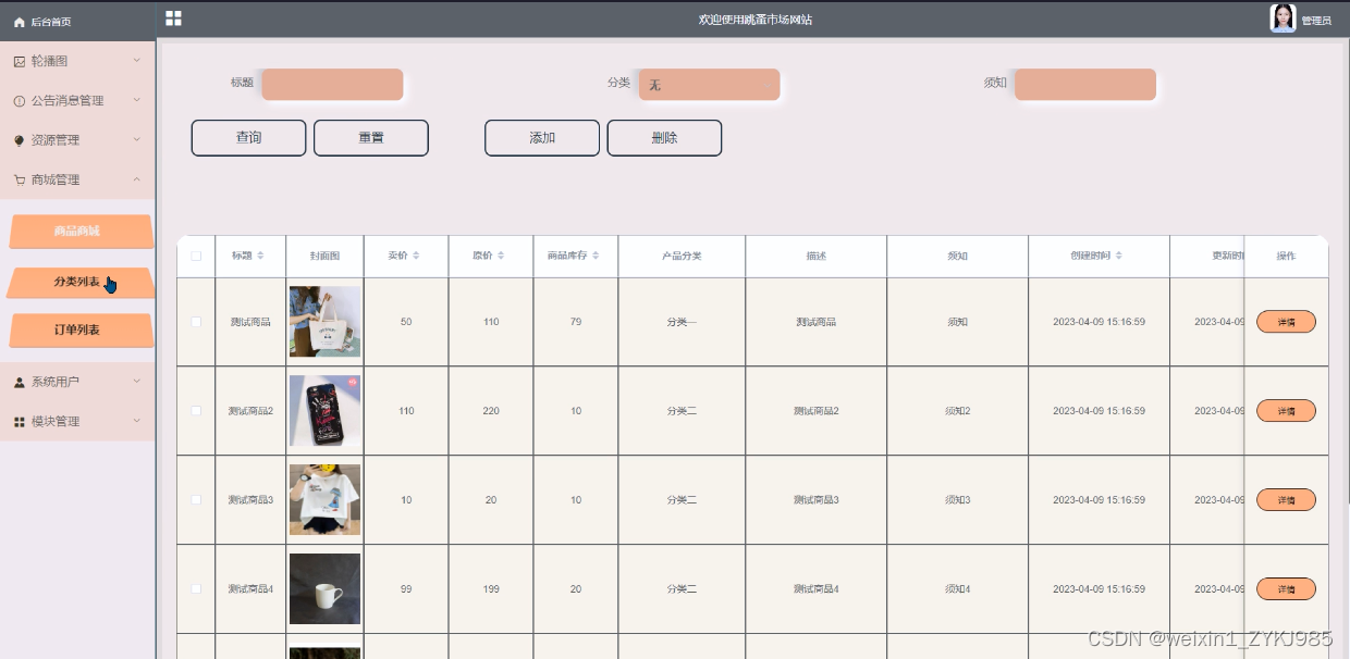 (5)轮播图/公告校管理:管理员可以对系统前台展示的轮播图以及公告消息进行增删改查,方便用户进行查看。