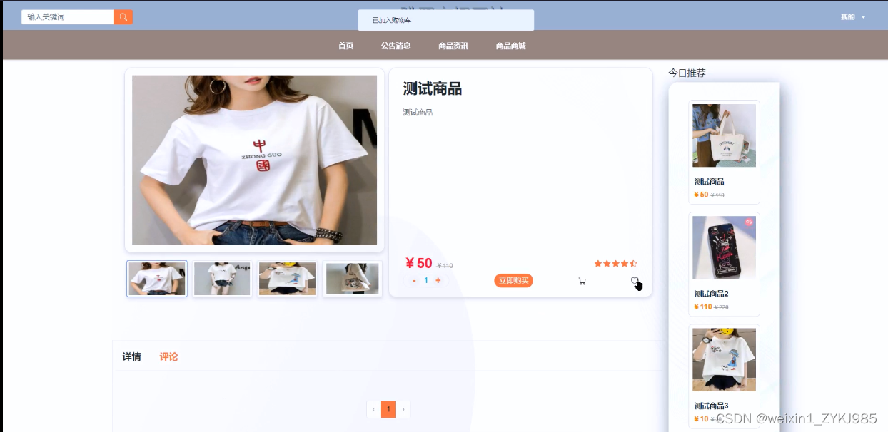 当访客点击了任意商品后将会进入该款商品的详情界面,可以了解到该商品的图片信息、商品信息、价钱信息等,同时可以对该商品进行加购+立即购买+收藏+点赞+评论,商品详情展示页面如图4-4所示。