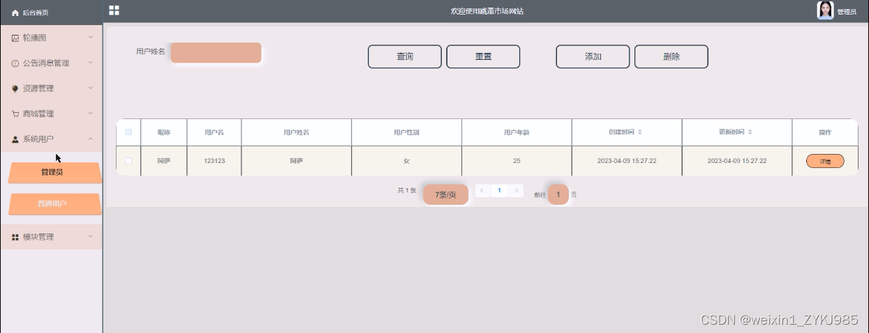 (1)用户管理:管理员可以对前台上注册过的用户信息进行管控,也可以对管理员信息进行管控。