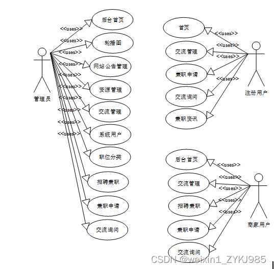 线上兼职平台系统的功能主要分为前台用户根据自己的需求进行注册登录,浏览职位信息并对选中的职位进行申请操作。后台系统管理员因职责的不同,分为普通管理员和超级管理员,普通管理员主要对申请单进行处理,而超级管理员主要对注册用户,新闻数据,职位详细信息,企业详细信息进行处理。