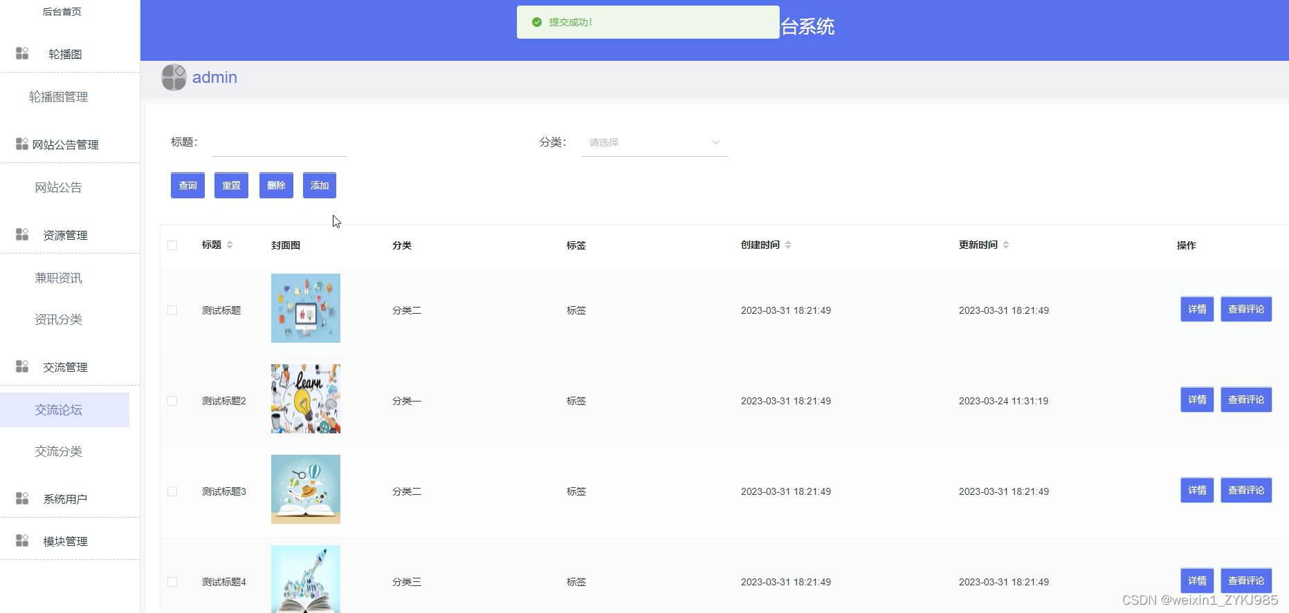 交流管理,在此页面可以查看交流论坛、交流分类的信息,并进行相关的操作。