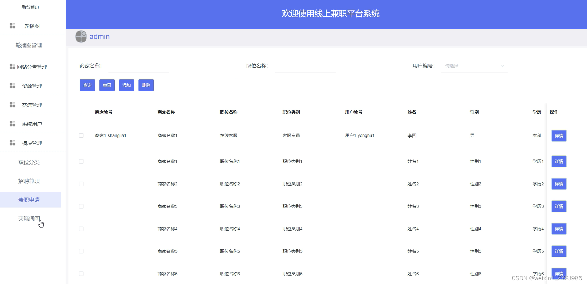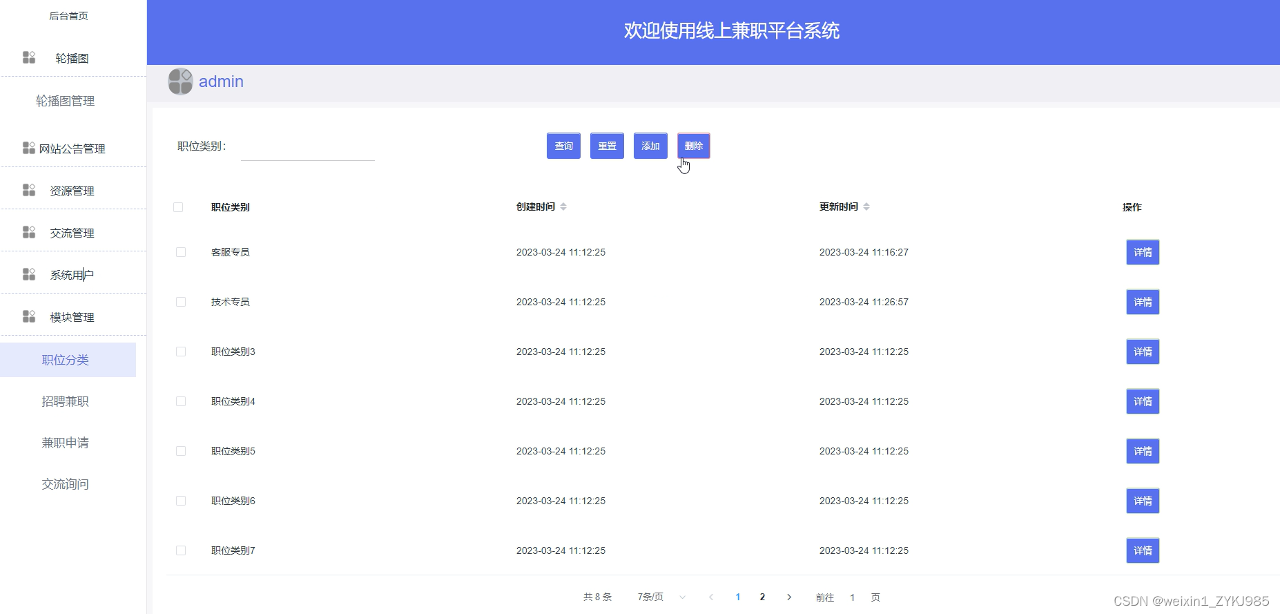 在模块管理页面,能查看职位分类、招聘兼职、兼职申请、交流询问的信息,并进行查询、重置、删除、添加等操作。