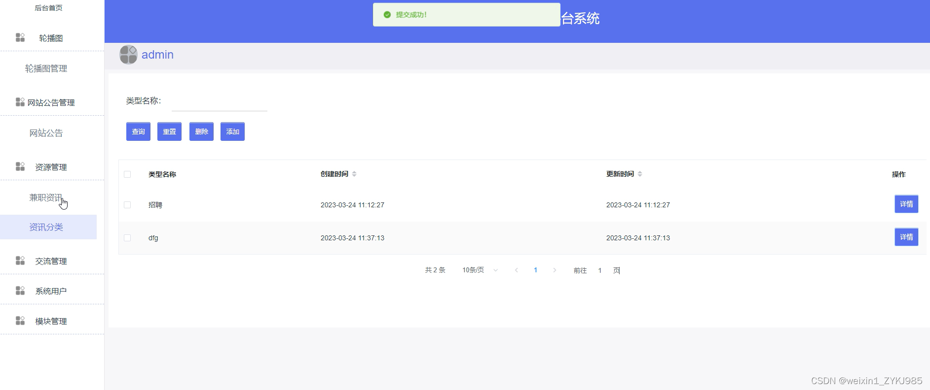 资源管理,在此页面可以查看兼职资讯、资讯分类的信息,进行查询、重置、删除、添加等操作。