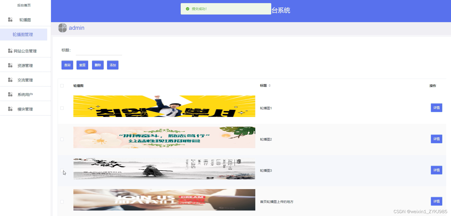 轮播图,在此页可以对轮播图进行查询、重置、删除、添加等操作。