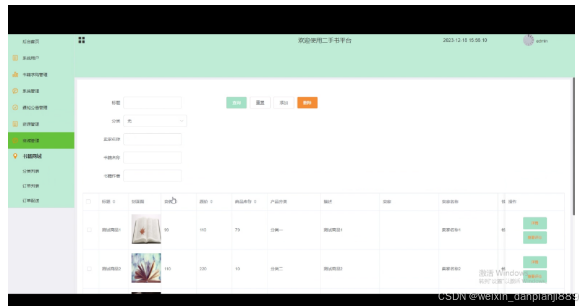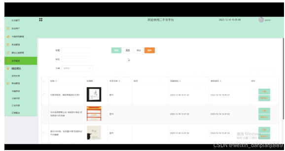 This article is based on the SpringBoot framework and designs and implements a second-hand book platform. This platform provides functional modules such as user management, book management, order management, and notification management. Users can register, log in, and manage personal information management, including searching for second-hand books, placing orders, making payments, and viewing orders; Sellers can publish, edit, and manage second-hand books; Administrators can publish platform notifications, book information, and display them to users for management. User information, book store, etc. At the same time, the platform also has functions such as user role management, permission control, and data persistence. Utilize the advantages of the SpringBoot framework to quickly build the entire system and achieve efficient development and deployment environments. This second-hand book platform can facilitate users to trade second-hand books, improve resource utilization efficiency, and meet personalized needs of users. In addition, reasonable permission control and data persistence ensure the security and stability of the system. In summary, the SpringBoot second-hand book platform has good scalability and maintainability, providing users with convenient second-hand book trading services.