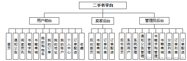 系功能模块分成了用户前台、卖家后台、管理员后台三个模块,每个模块登录进去对应相应的功能,具体的功能模块图如图3.1所示。