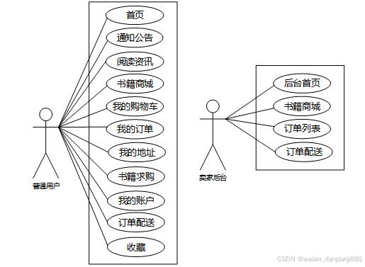 二手书平台中普通用户、卖家角色用例图如图2.1所示: