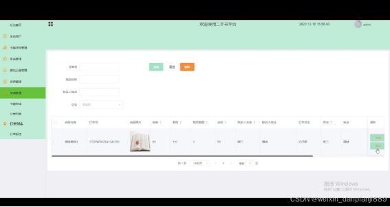 管理员点击 “订单列表”这个菜单,可以查看到系统中所有的订单信息,支持通过订单号、书籍名称、联系人姓名等关键字进行查询,如果想要了解某一订单的详细信息,点击即可进入详情查看界面。也可在列表页面进行查询、重置、删除、配送等操作。界面如下图所示。