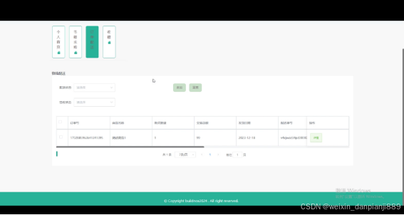 用户点击后台个人中心中的“订单配送”这个菜单,可以查看本人所有订单对应的配送信息,支持通过筛选配送状态、签收状态等方式查询,如果想要了解某一订单配送的详细信息,点击即可进入详情查看界面。在列表页面可以对配送信息进行查询、重置等操作。界面如下图所示。