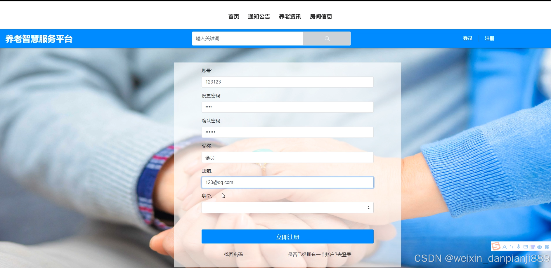 养老智慧服务平台的注册用户时可以进行注册登录,当用户右上角“注册”按钮的时候,当填写上自己的账号+密码+确认密码+昵称+邮箱+手机号等后再点击“注册”按钮后将会先验证输入的有没有空数据,再次验证密码和确认密码是否是一样的,最后验证输入的账户名和数据库表中已经注册的账户名是否重复,只有都验证没问题后即可用户注册成功。其用用户注册界面展示如下图5-2所示。