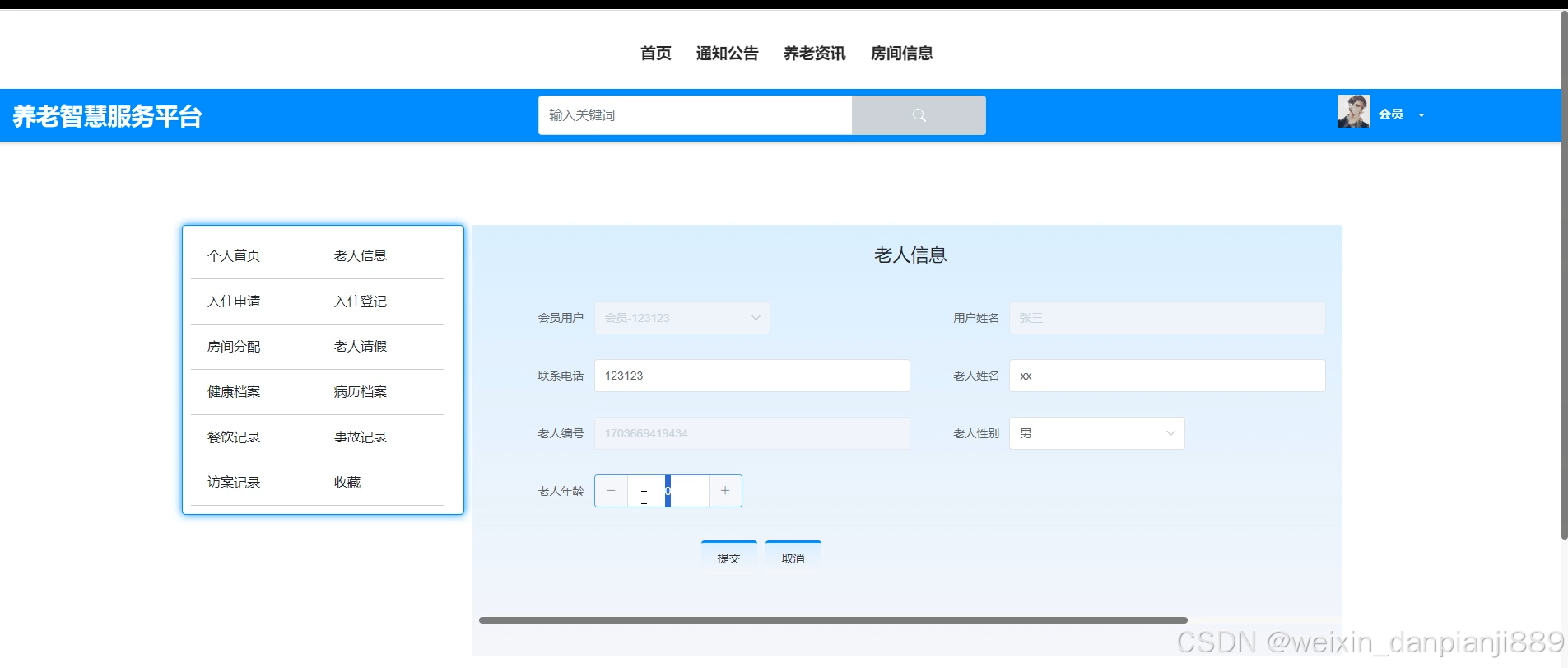 (2)查看养老智慧服务平台的首页信息:首页、通知公告、养老资讯、房间信息、个人中心(首页、老人信息、入住申请、入住登记、房间分配、老人请假、健康档案、病历档案.、餐饮记录、事故记录、访案记录、收藏)等。