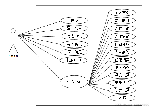 (7)个人中心:用户在前台点击“个人中心”可以对个人首页、老人信息、入住申请、入住登记、房间分配、老人请假、健康档案、病历档案、餐饮记录、事故记录、访案记录、收藏进行管理。用户可以编辑自己的用户信息和健康档案;可以进行申请入住以及入住登记;可以管理查看房间分配;可以管理添加请假信息;可以对病历档案、餐饮记录、事故记录、访案记录进行管理,也可以对已收藏的信息进行管理。