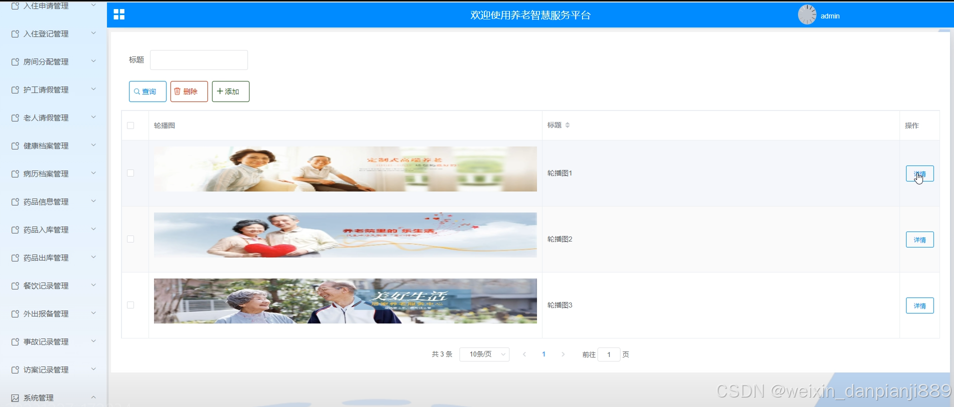 养老智慧服务平台中的管理人员在“系统管理”这一菜单下是可以对养老智慧服务平台内的轮播图进行添加修改的,其管理界面如下图5-11所示。