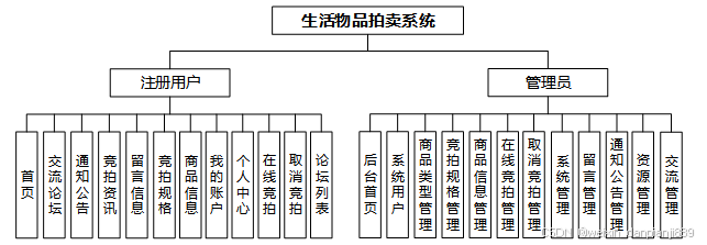 系功能模块分成了管理员及注册用户两个模块,每个模块登录进去对应相应的功能,具体的功能模块图如图3.1所示。