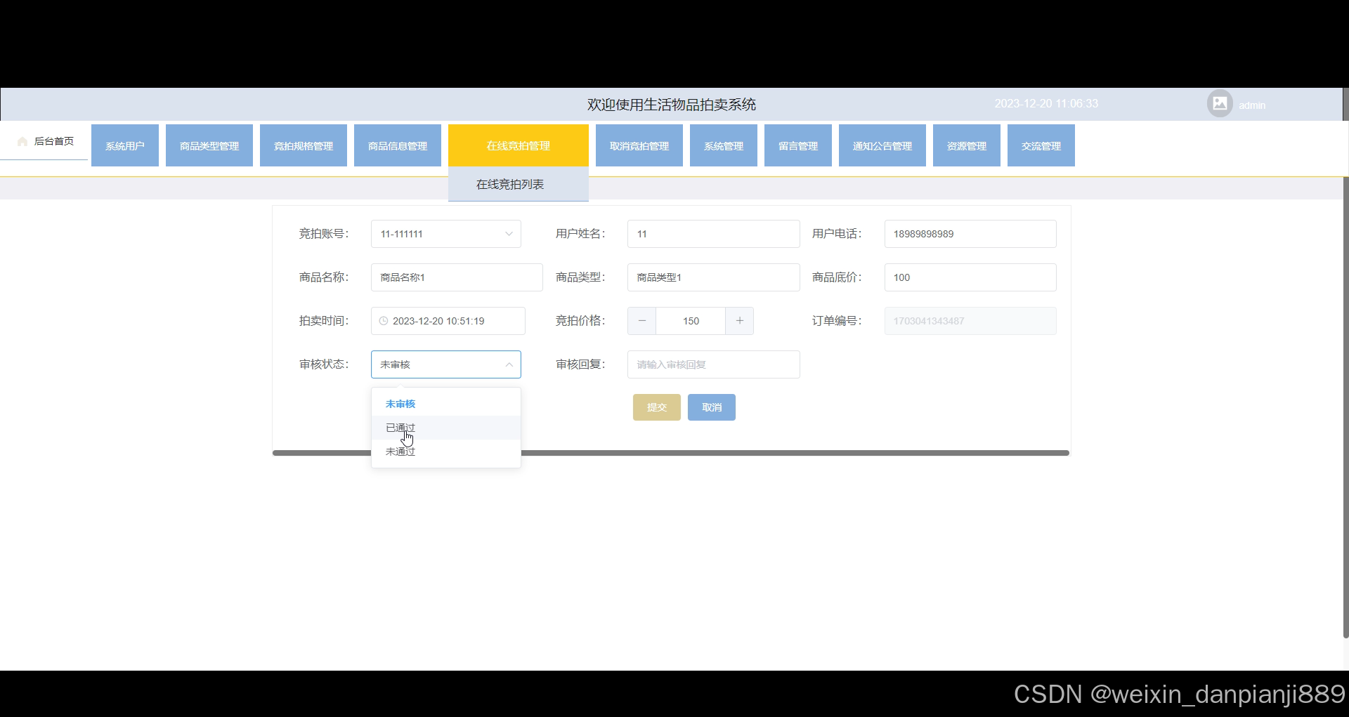 管理员可以添加、编辑、删除、审核商品信息,包括商品描述、图片、起拍价等。确保商品信息的准确性和完整性,为用户提供真实可靠的竞拍商品。界面如下图所示。