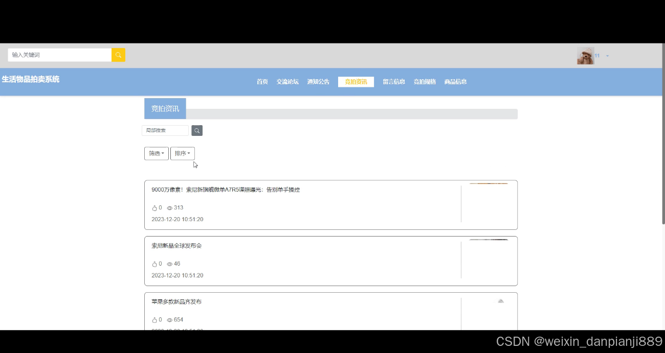 用户点击“竞拍资讯”这个菜单,可以查看到系统中所有添加的资讯信息,支持通过关键词进行查询,如果想要了解某一竞拍资讯的详细信息,点击后面的“详情”会进入详情查看界面,可以对竞拍资讯进行查看、点赞、收藏、评论等操作;界面如下图所示。