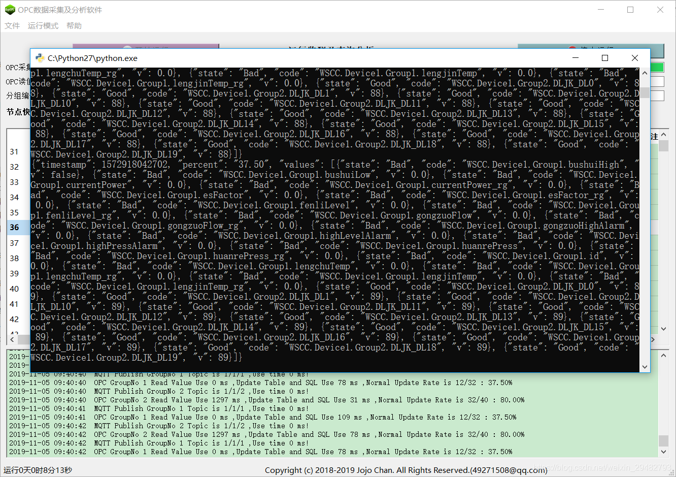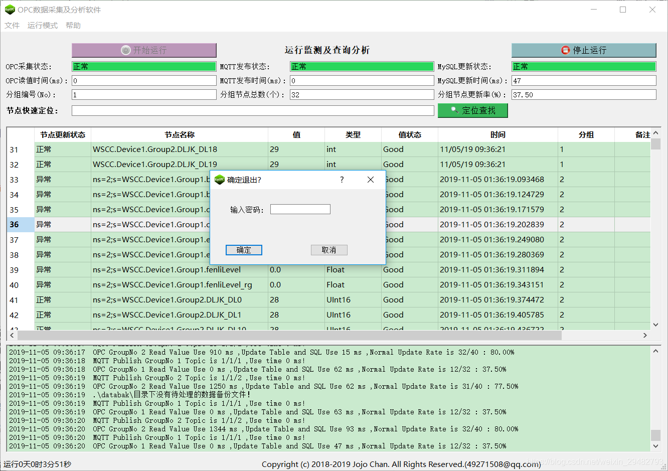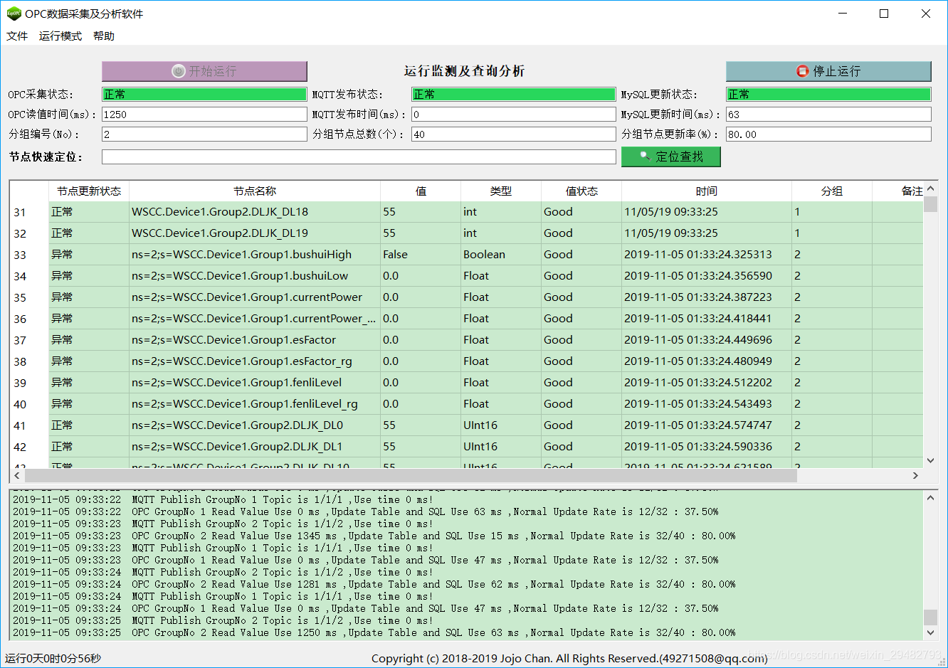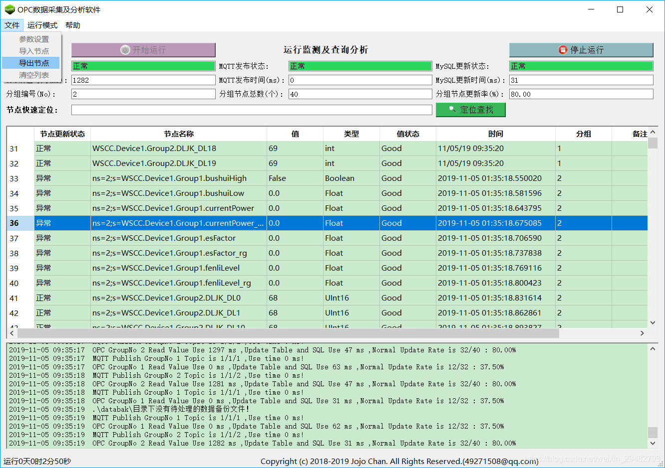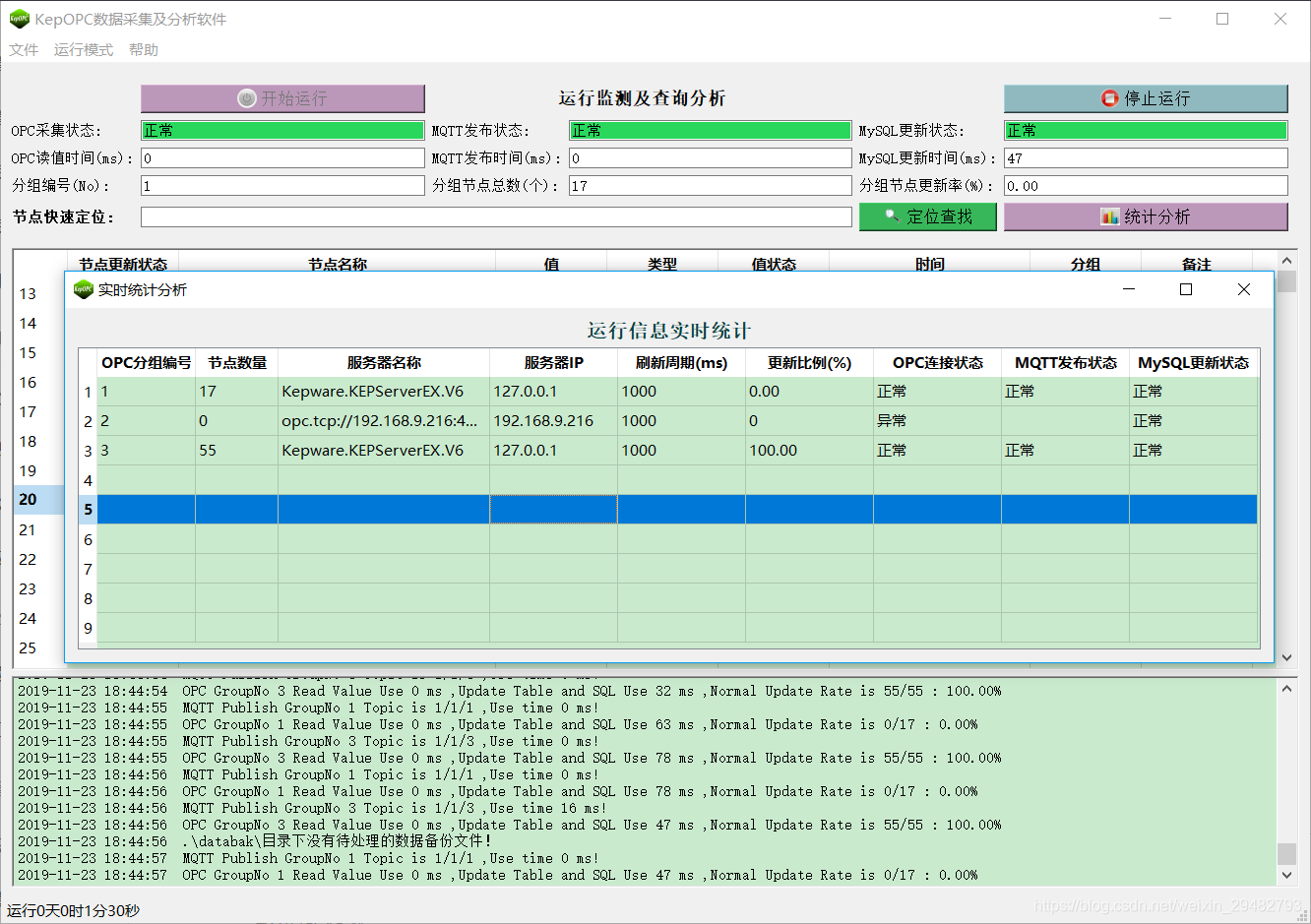 (3) OPC-MySQL:按照设定周期记录节点值、状态、类型、更新状态到MySQL数据库;支持OPC服务器分组连接状态及节点正常更新比例到MySQL数据库,节点变化数据存储历史表功能;