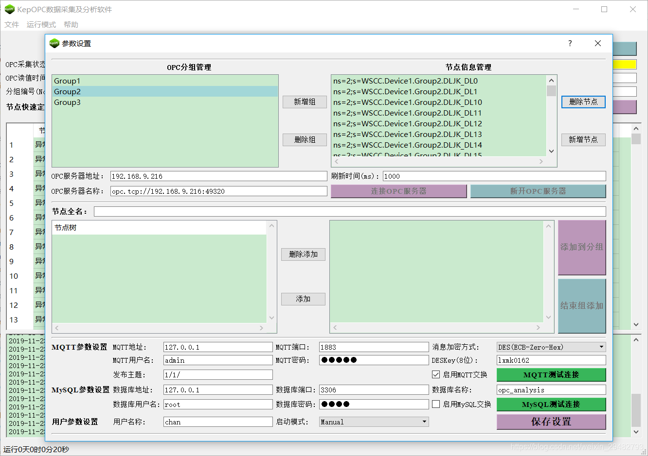 (2) 参数设置:支持OPC服务器及节点的分组管理(分组添加和删除、分组节点的添加和删除、)、MySQL数据库及MQTT参数配置,json格式内容采用DES(ECB-Zero-HEX/None可选)加密发布更加安全;