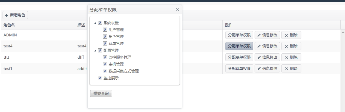 显示时,根据行选的用户已有权限需要默认打钩,点击“提交查询”按钮,form提交,根据勾选情况,入库。
