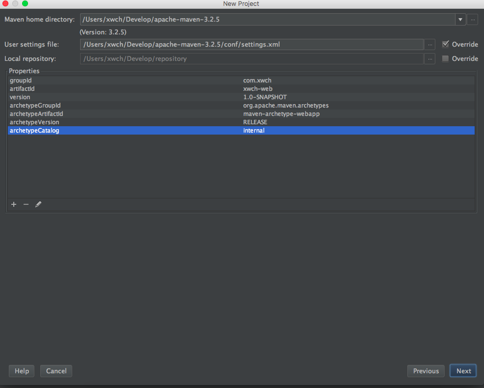 5.选择Maven home 目录,Maven的setting文件和本地仓库地址reporitory。为了让项目在创建的时候可以快速构建,需要在Properties增加参数:archetypeCatalog=internal,这个参数的意思是插件使用内部的archetype元数据,如果不加该参数,则默认从remote中央仓库下载,这样会导致构建很慢,而且有可能构建失败,这样就只有一个pom.xml文件,其余的目录结构都不会生成了。
