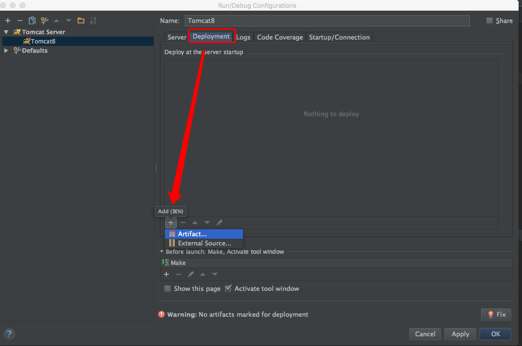 然后点击Deployment目录栏,添加Artifact,选择war exploded,OK。