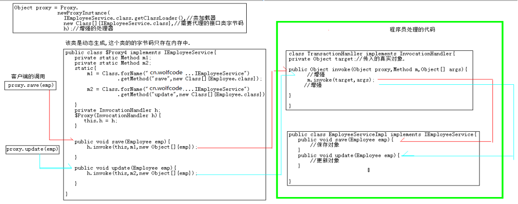 public class JDKProxy implements InvocationHandler { @Setter private Object target; @Setter private TransactionManager txManager; //java.lang.reflect.Proxy是java所有动态代理类的父类 public Object getProxy(){ /**Proxy.newProxyInstance提供了一组静态方法为一组接口动态的生成代理类及对象 * 第一个参数:类加载器 * 第二个参数:目标对象实现的接口的字节码数据对象 * 第三个参数:实现了InvocationHandler接口的类的对象(代理类) * (本类可实现此接口,成为代理类) */ return Proxy.newProxyInstance(this.getClass().getClassLoader(), target.getClass().getInterfaces(), this); } @Override public Object invoke(Object proxy, Method method, Object[] args) throws Throwable { /** * proxy:代理对象 * method:当前调用的真实方法,利用反射使用方法 * 方法的使用,方法.invoke(对象名,参数) * args:当前调用方法的实参 */ try { //开启事务 txManager.begin(); //处理事务 method.invoke(target,args); //提交事务 txManager.commit(); }catch (Exception e){ //回滚事务 txManager.rollback(); }finally { //释放资源 txManager.destroy(); } return null; } }