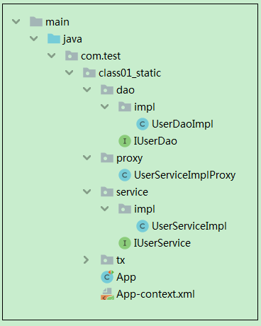 <?xml version="1.0" encoding="UTF-8"?> <beans xmlns="http://www.springframework.org/schema/beans" xmlns:xsi="http://www.w3.org/2001/XMLSchema-instance" xsi:schemaLocation="http://www.springframework.org/schema/beans http://www.springframework.org/schema/beans/spring-beans.xsd"> <!--事务管理器--> <bean id="txManager" class="com.test.class01_static.tx.TransactionManager"/> <bean id="userDao" class="com.test.class01_static.dao.impl.UserDaoImpl"/> <!--代理对象,属性中的userService和Service为同一个实现类,使用id区分--> <bean id="proxy" class="com.test.class01_static.proxy.UserServiceImplProxy"> <property name="userService" ref="userService"/> <property name="txManager" ref="txManager"/> </bean> <!--被代理对象--> <bean id="userService" class="com.test.class01_static.service.impl.UserServiceImpl"> <property name="userDao" ref="userDao"/> </bean> </beans>