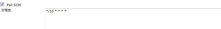 选择"Build when a change is pushed to GitHub "和"Poll SCM ",这两项的作用分别是当GitHub有版本库更新时触发Jenkins进行构建和定期检查版本库是否有更新,如果有更新则触发Jenkins进行构建,如下图,表示每10分钟检查一次版本库是否更新