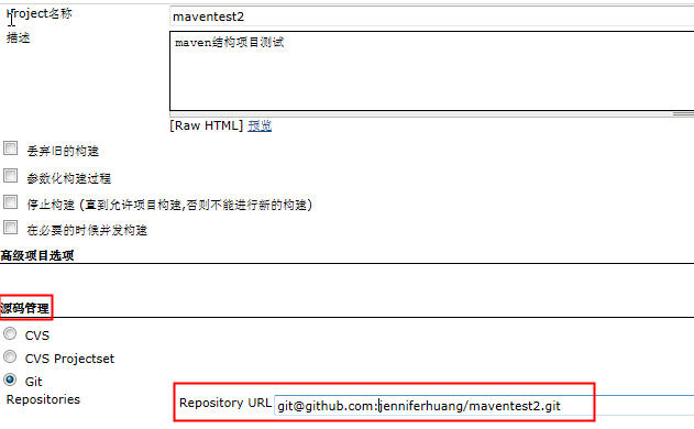 2.1通过配置Git库URL告诉jenkins源代码位置,如下图: