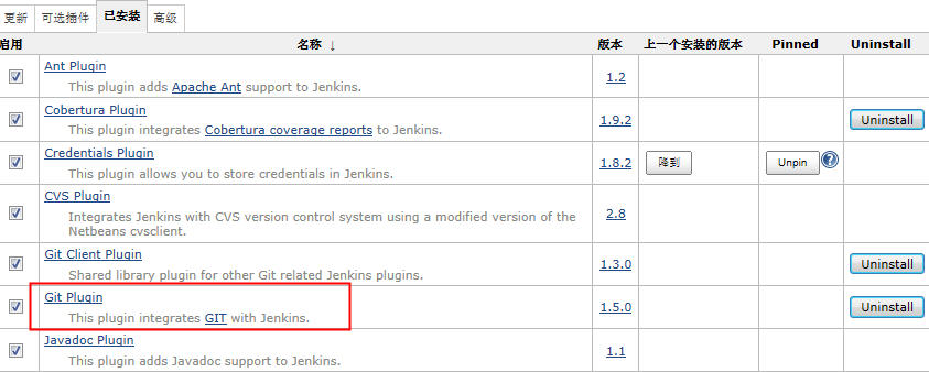 点击系统管理->管理插件 在"可选插件"Tab里找到 Git Plugin ,安装该插件, 装完后重启, 在“已安装”Tab可找到该插件