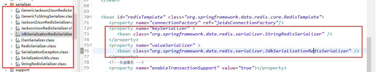 <?xml version="1.0" encoding="UTF-8"?> <beans xmlns="http://www.springframework.org/schema/beans" xmlns:xsi="http://www.w3.org/2001/XMLSchema-instance" xmlns:context="http://www.springframework.org/schema/context" xmlns:aop="http://www.springframework.org/schema/aop" xmlns:tx="http://www.springframework.org/schema/tx" xsi:schemaLocation="http://www.springframework.org/schema/beans http://www.springframework.org/schema/beans/spring-beans-4.0.xsd http://www.springframework.org/schema/context http://www.springframework.org/schema/context/spring-context-4.0.xsd http://www.springframework.org/schema/aop http://www.springframework.org/schema/aop/spring-aop-4.0.xsd http://www.springframework.org/schema/tx http://www.springframework.org/schema/tx/spring-tx-4.0.xsd"> <description>redis哨兵</description> <!-- 加载properties文件 --> <bean id="propertyPlaceholderConfigurer" class="org.springframework.beans.factory.config.PropertyPlaceholderConfigurer"> <property name="locations"> <list> <value>classpath*:/com/config/redis-sentinel.properties</value> </list> </property> </bean> <!-- 配置JedisPoolConfig实例 --> <bean id="jedisPoolConfig" class="redis.clients.jedis.JedisPoolConfig"> <!--最大空闲数--> <property name="maxIdle" value="${redis.maxIdle}" /> <!-- 最小空闲数 --> <property name="minIdle" value="${redis.minIdle}" /> <!--连接池的最大数据库连接数 --> <property name="maxTotal" value="${redis.maxTotal}" /> <!-- 最大等待时间 单位毫秒(ms) --> <property name="maxWaitMillis" value="${redis.maxWaitMillis}" /> <!-- 使用连接时测试连接是否可用 --> <property name="testOnBorrow" value="${redis.testOnBorrow}" /> </bean> <!-- 第一种配置方式 --> <!--配置文件加载--> <bean id="resourcePropertySource" class="org.springframework.core.io.support.ResourcePropertySource"> <constructor-arg name="name" value="redis-sentinel.properties"/> <constructor-arg name="resource" value="classpath:/com/config/redis-sentinel.properties"/> </bean> <!-- Redis集群配置 这里使用的是spring-data-redis 包中内容 --> <!--redisCluster配置--> <bean id="redisSentinelConfiguration" class="org.springframework.data.redis.connection.RedisSentinelConfiguration"> <constructor-arg name="propertySource" ref="resourcePropertySource"/> </bean> <!-- jedis客户端连接工厂 --> <bean id="jeidsConnectionFactory" class="org.springframework.data.redis.connection.jedis.JedisConnectionFactory"> <constructor-arg name="sentinelConfig" ref="redisSentinelConfiguration"/> <constructor-arg name="poolConfig" ref="jedisPoolConfig"/> <property name="password" value="${redis.password}"></property> <property name="timeout" value="${redis.timeout}"></property> </bean> <!-- 第二种配置方式 --> <!-- redis集群配置 哨兵模式 --> <!-- <bean id="redisSentinelConfiguration" class="org.springframework.data.redis.connection.RedisSentinelConfiguration"> --> <!-- <property name="master"> --> <!-- <bean class="org.springframework.data.redis.connection.RedisNode"> --> <!-- 这个值要和Sentinel中指定的master的值一致,不然启动时找不到Sentinel会报错的 --> <!-- <property name="name" value="${redis.masterName}" /> --> <!-- </bean> --> <!-- </property> --> <!-- sentinel哨兵监控, 这里是指定Sentinel的IP和端口,不是Master和Slave的 --> <!-- <property name="sentinels"> --> <!-- <set> --> <!-- <bean name="sentinelNode1" class="org.springframework.data.redis.connection.RedisNode"> --> <!-- <constructor-arg name="host" value="${redis.sentinel.host1}"></constructor-arg> --> <!-- <constructor-arg name="port" value="${redis.sentinel.port1}"></constructor-arg> --> <!-- </bean> --> <!-- <bean name="sentinelNode2" class="org.springframework.data.redis.connection.RedisNode"> --> <!-- <constructor-arg name="host" value="${redis.sentinel.host2}"></constructor-arg> --> <!-- <constructor-arg name="port" value="${redis.sentinel.port2}"></constructor-arg> --> <!-- </bean> --> <!-- <bean name="sentinelNode3" class="org.springframework.data.redis.connection.RedisNode"> --> <!-- <constructor-arg name="host" value="${redis.sentinel.host3}"></constructor-arg> --> <!-- <constructor-arg name="port" value="${redis.sentinel.port3}"></constructor-arg> --> <!-- </bean> --> <!-- </set> --> <!-- </property> --> <!-- </bean> --> <!-- <bean id="jeidsConnectionFactory" class="org.springframework.data.redis.connection.jedis.JedisConnectionFactory"> --> <!-- <constructor-arg name="sentinelConfig" ref="redisSentinelConfiguration"></constructor-arg> --> <!-- <constructor-arg name="poolConfig" ref="jedisPoolConfig"></constructor-arg> --> <!-- <property name="password" value="${redis.password}"></property> --> <!-- <property name="timeout" value="${redis.timeout}"></property> --> <!-- </bean> --> <bean id="redisTemplate" class="org.springframework.data.redis.core.RedisTemplate"> <property name="connectionFactory" ref="jeidsConnectionFactory"/> <property name="keySerializer" > <bean class="org.springframework.data.redis.serializer.StringRedisSerializer" /> </property> <property name="valueSerializer" > <bean class="org.springframework.data.redis.serializer.JdkSerializationRedisSerializer" /> </property> <!-- 开启事务 --> <property name="enableTransactionSupport" value="true"></property> </bean> </beans>