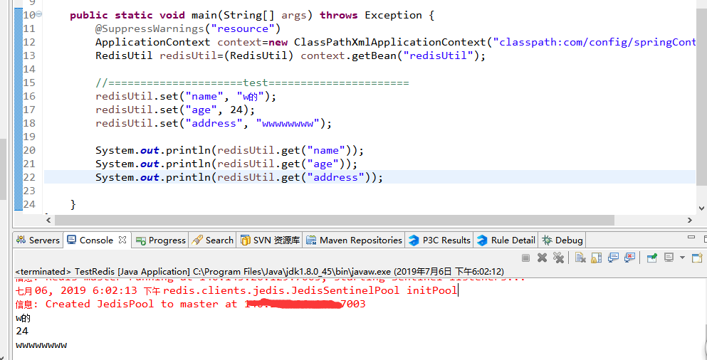 package test; import org.springframework.context.ApplicationContext; import org.springframework.context.support.ClassPathXmlApplicationContext; import com.pinghengxing.util.RedisUtil; public class TestRedisSentinel { public static void main(String[] args) throws Exception { @SuppressWarnings("resource") ApplicationContext context=new ClassPathXmlApplicationContext("classpath:com/config/springContext.xml"); RedisUtil redisUtil=(RedisUtil) context.getBean("redisUtil"); //=====================test====================== redisUtil.set("name", "w的"); redisUtil.set("age", 24); redisUtil.set("address", "wwwwwwww"); System.out.println(redisUtil.get("name")); System.out.println(redisUtil.get("age")); System.out.println(redisUtil.get("address")); } }