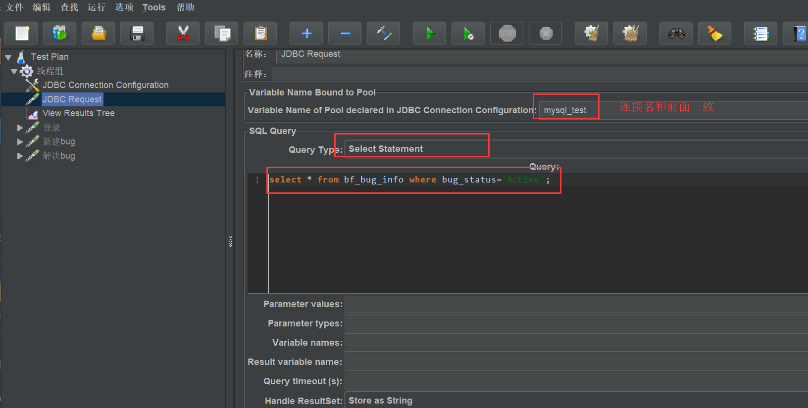 Variable Name:与JDBC Connection Configuration中的Variable Name保持一致