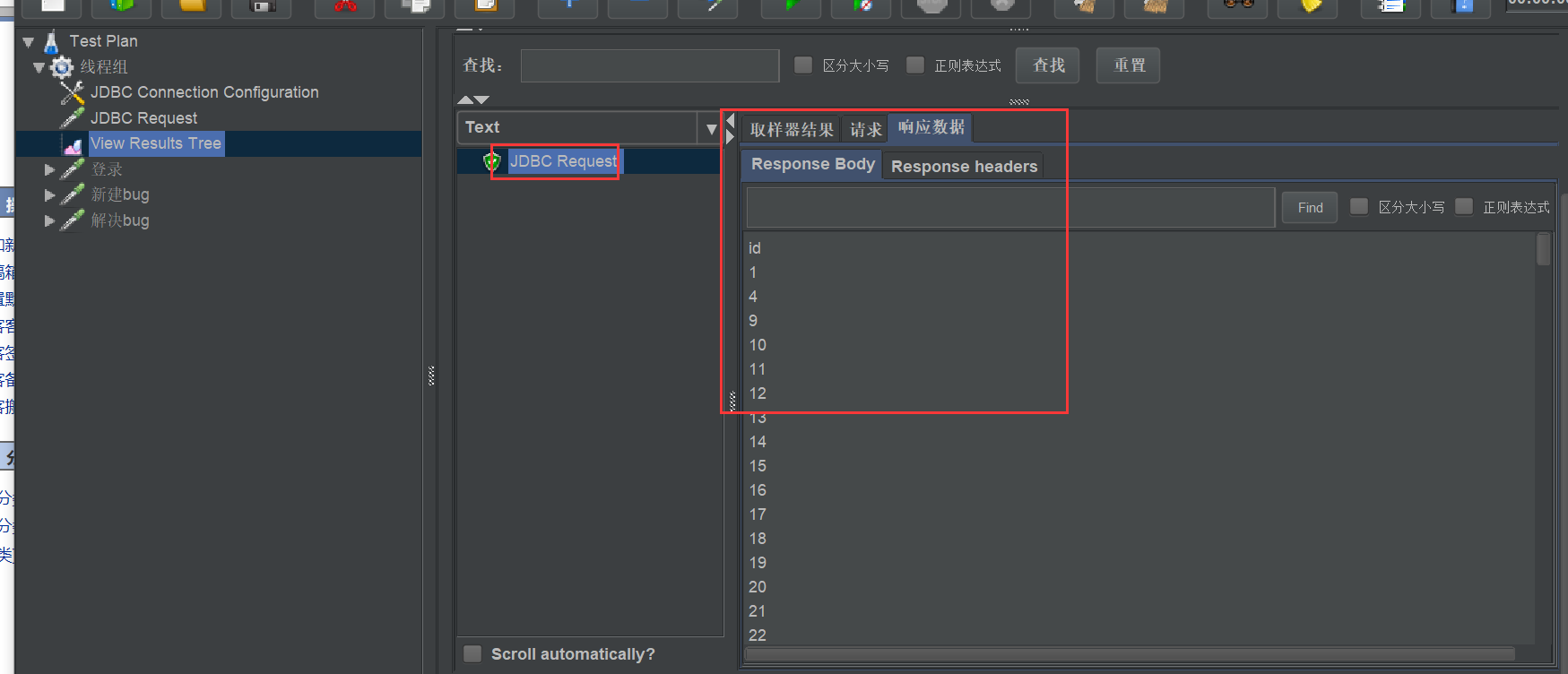 以上就已经完成一个jdbc的请求了,可以添加察看结果树,看是否成功。