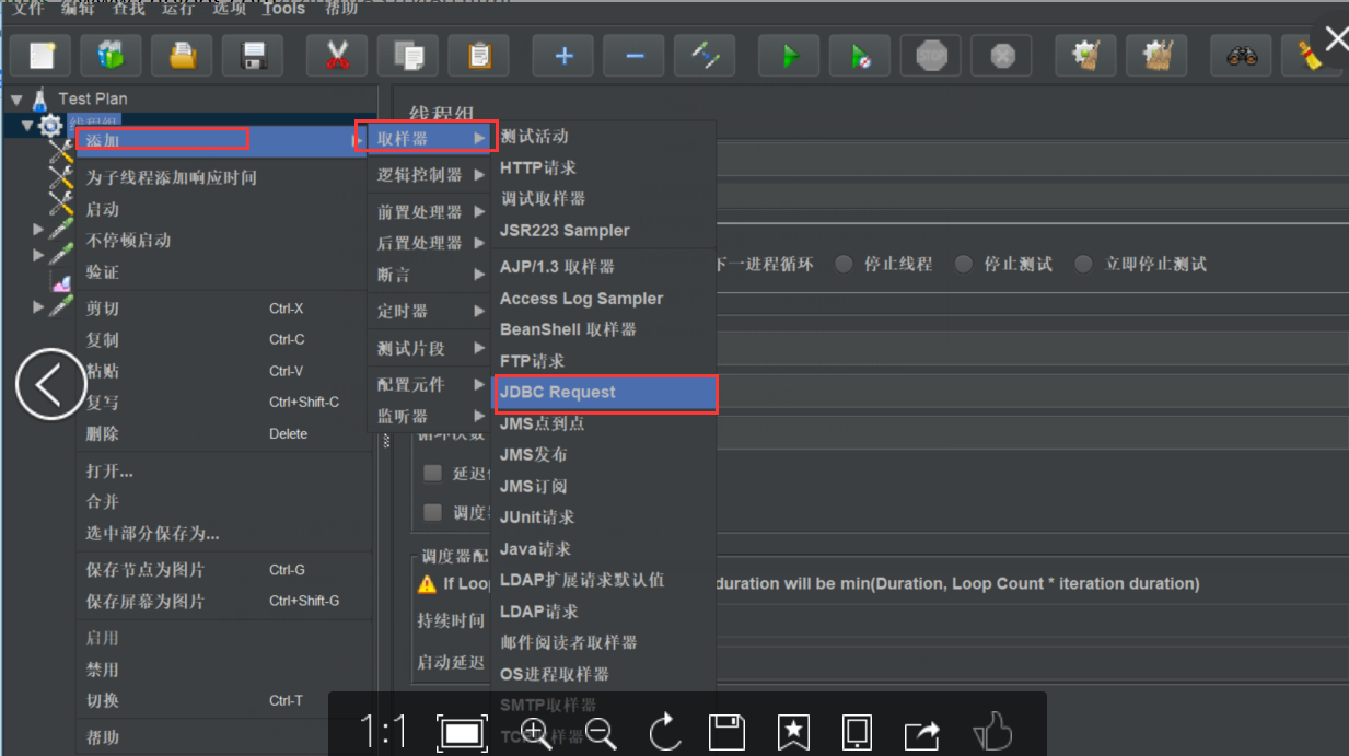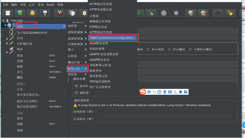 2、然后,新建一个线程组→JDBC Connection Configuration(连接数据库组件)→JDBC Request(JDBC请求)