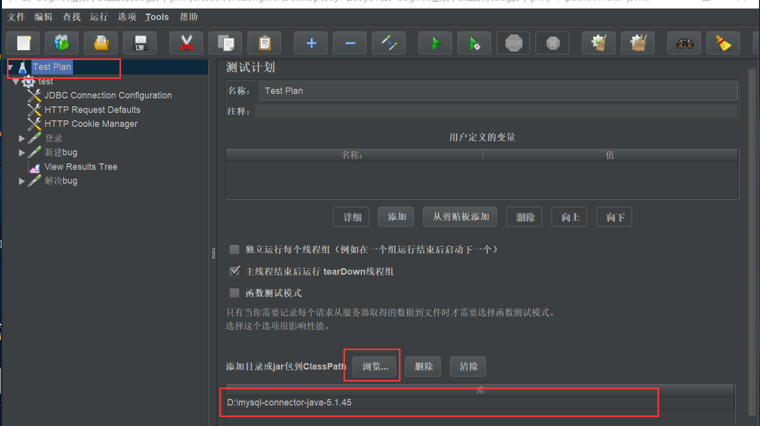1、首先,我们在测试计划下,把JDBC驱动包添加上,也可以将驱动包放入jmeter的lib目录下,即可自动加载。
