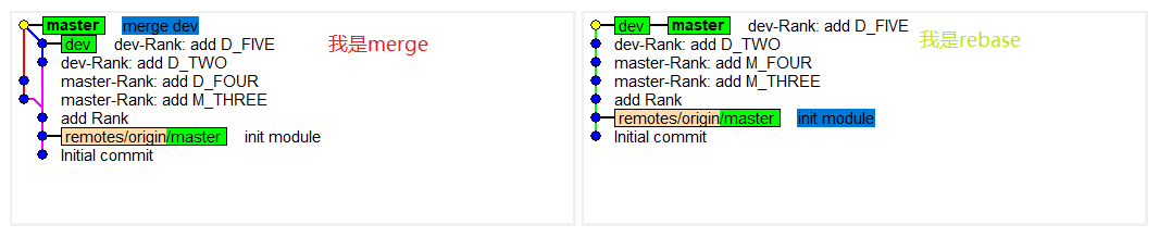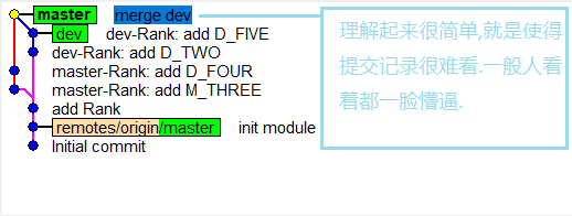 以master为主线,将dev分支的新提交一次一次的加到master提交的后面(这一切都是在dev的分支上进行,并不影响master分支)