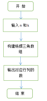 输入n和k的值,创建一个二维数组,通过循环,在第一个循环里,定义i=1,在循环里嵌套循环,定义当j=0时,先判断j是否等于0或者i是否等于j,若成立则输出arr[i-1][j]=1,否则第i-1行j列的数等于第i-2行j列的数与第i-2行j-1列的数之和。最后输出结果。